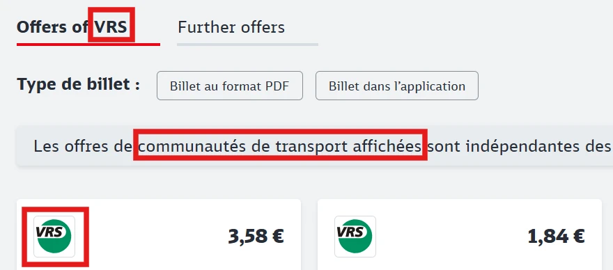 Pour s’orienter, il est aussi possible de vérifier dans DB Navigator ou sur le site de la DBsi des billets de réseau sont vendus pour un trajet. Ceux-ci sont indiqués comme Verbund-Angebote, avec le logo et sous les offres du [nom du réseau].