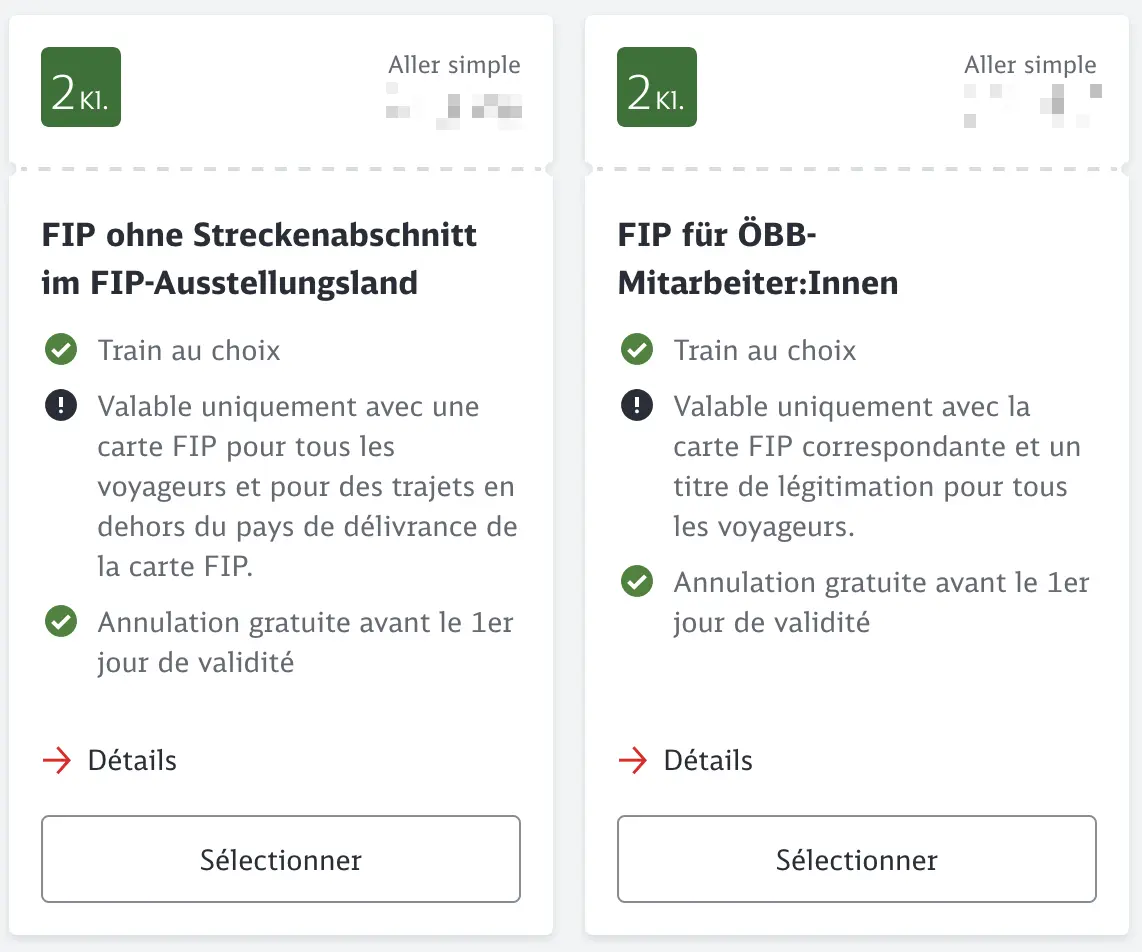 Les employés et employées des ÖBB, SBB et PKP peuvent également réserver des billets qui ne sont valables que pour la section allemande du trajet. Pour la section du trajet dans leur propre pays, un billet supplémentaire est requis, car le prix du billet est calculé uniquement à partir de la frontière allemande. Le billet n’est pas valable dans le pays d’émission de la Carte FIP.